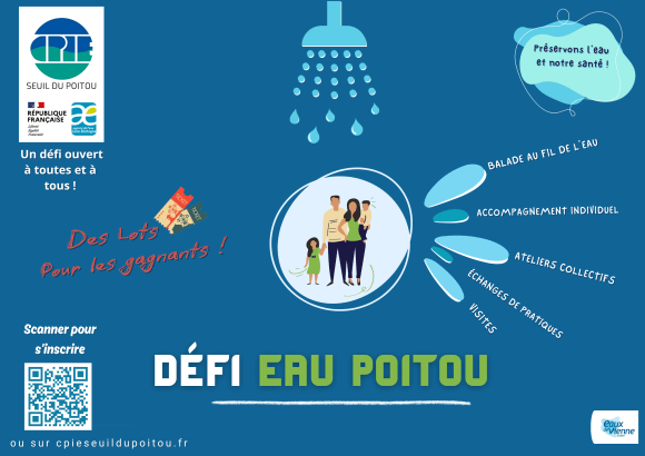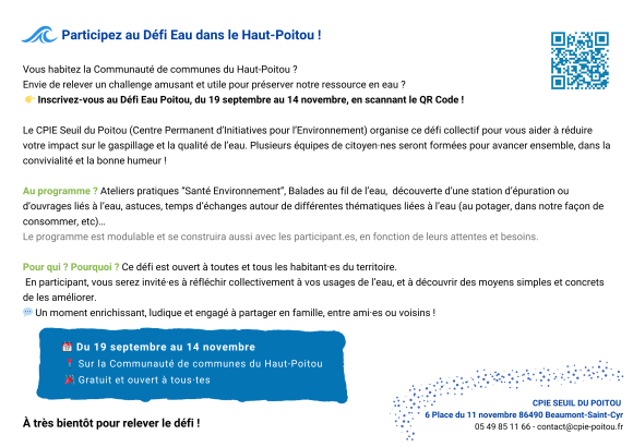 Vous habitez la communauté de communes du Haut Poitou, et vous souhaitez participer à un défi ludique pour préserver notre ressource en eau ? N’hésitez plus, contactez le CPIE Seuil du Poitou pour vous inscrire, au 05 49 85 11 66 ou en cliquant ci dessous :