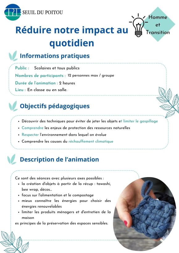 - Animation sur une thématique (recyclage, eau potable, biodiversité…)
